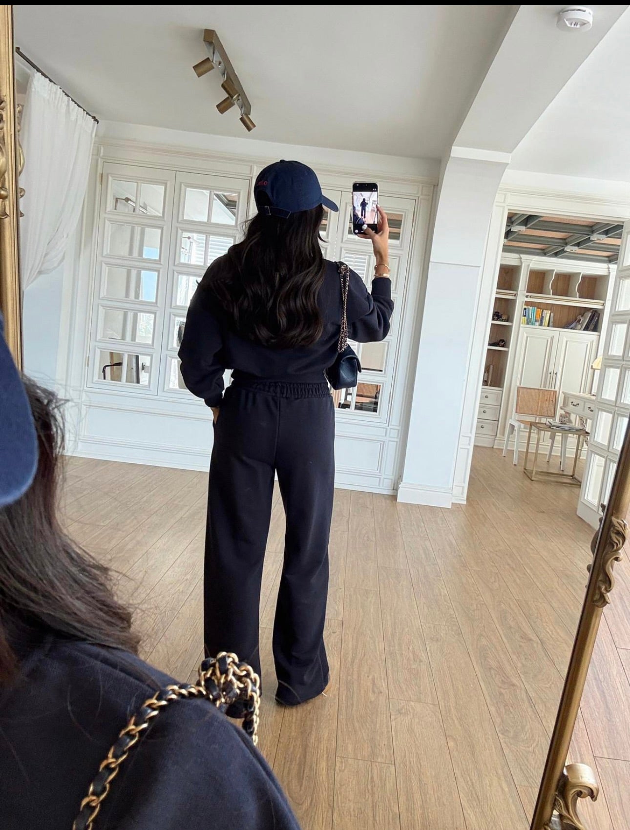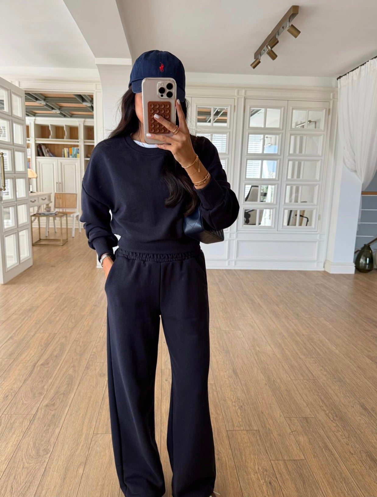 Cet ensemble noir se compose d’un pantalon fluide taille haute et d’un sweat à la coupe droite légèrement cropped.