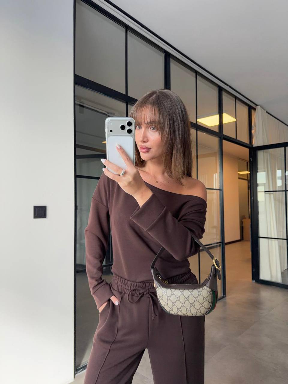 Cet ensemble en maille légère et fluide se distingue par son col bateau délicatement tombant sur l’épaule, créant une allure féminine et moderne.