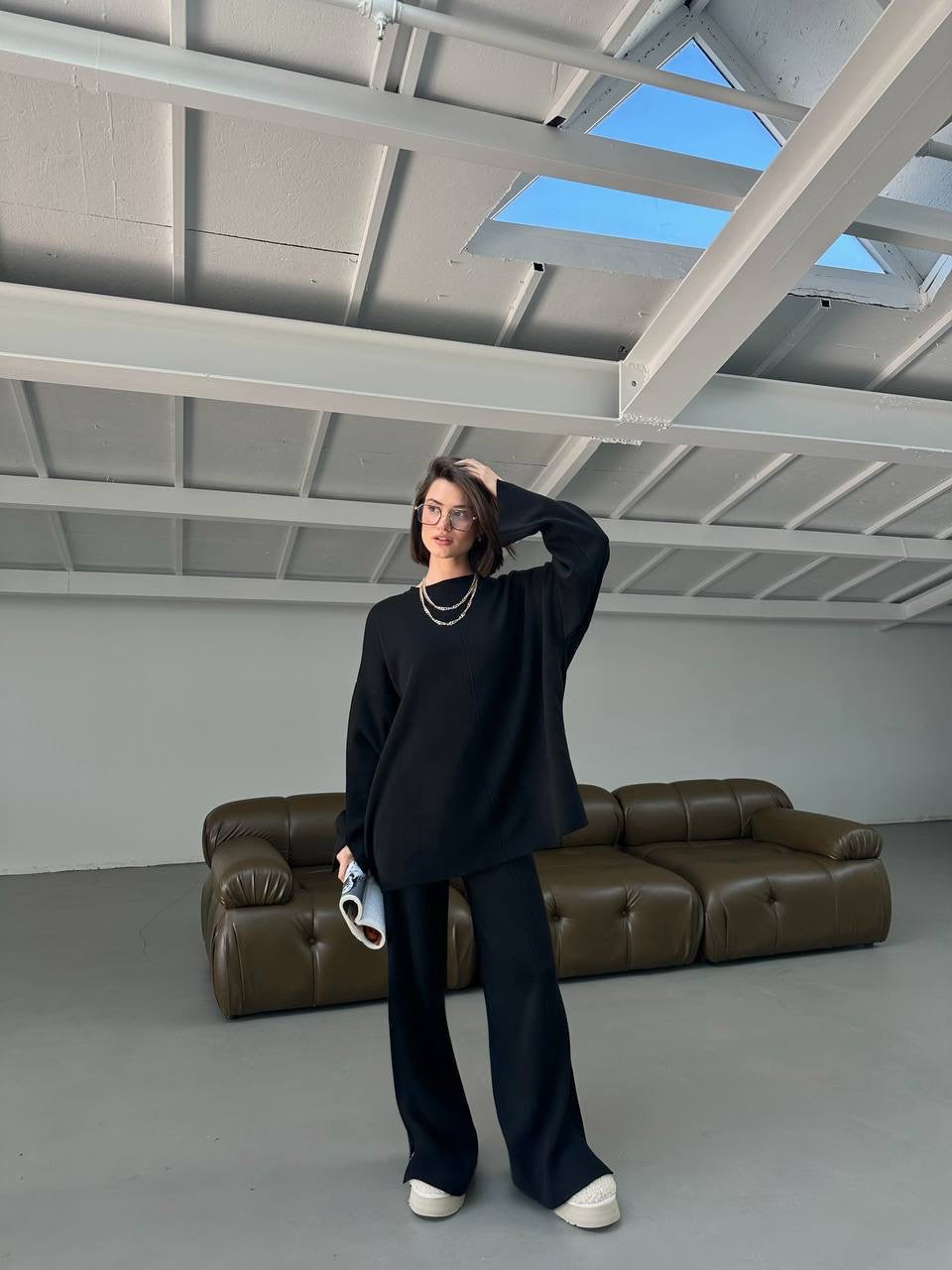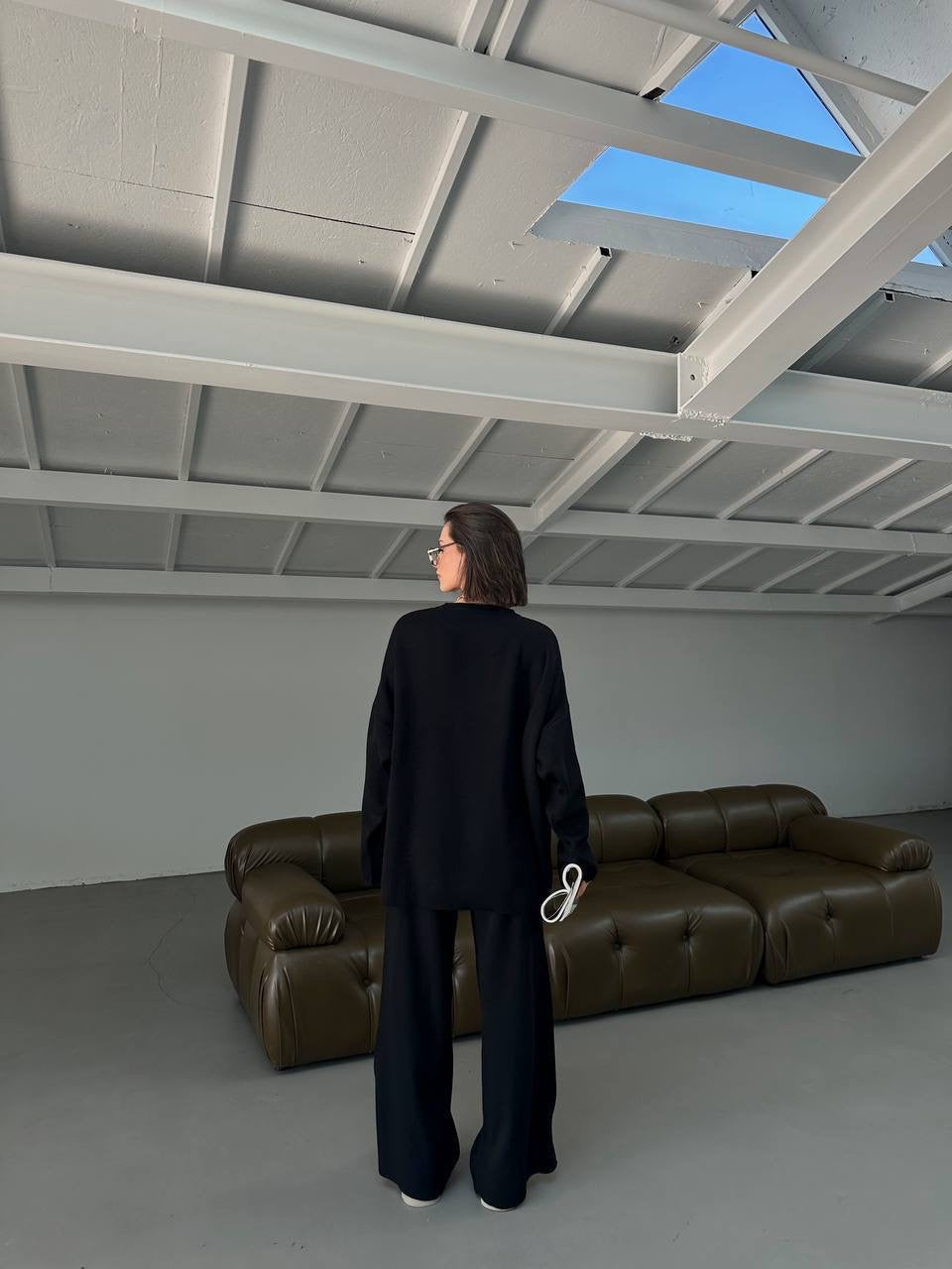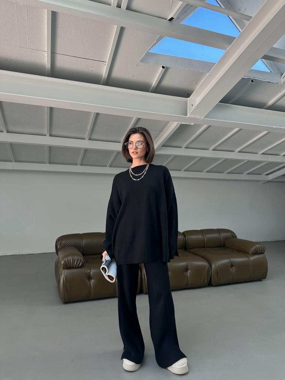 Cet ensemble en maille douce se compose d’un pull oversize à col rond et d’un pantalon fluide à la coupe droite, pour un tombé élégant et un confort absolu.