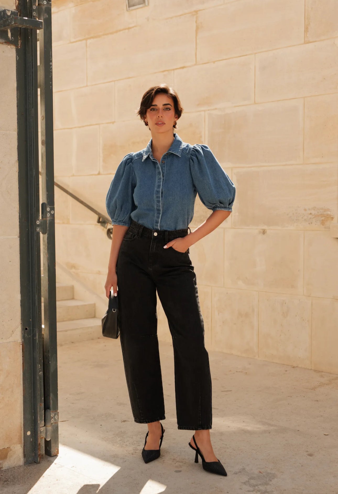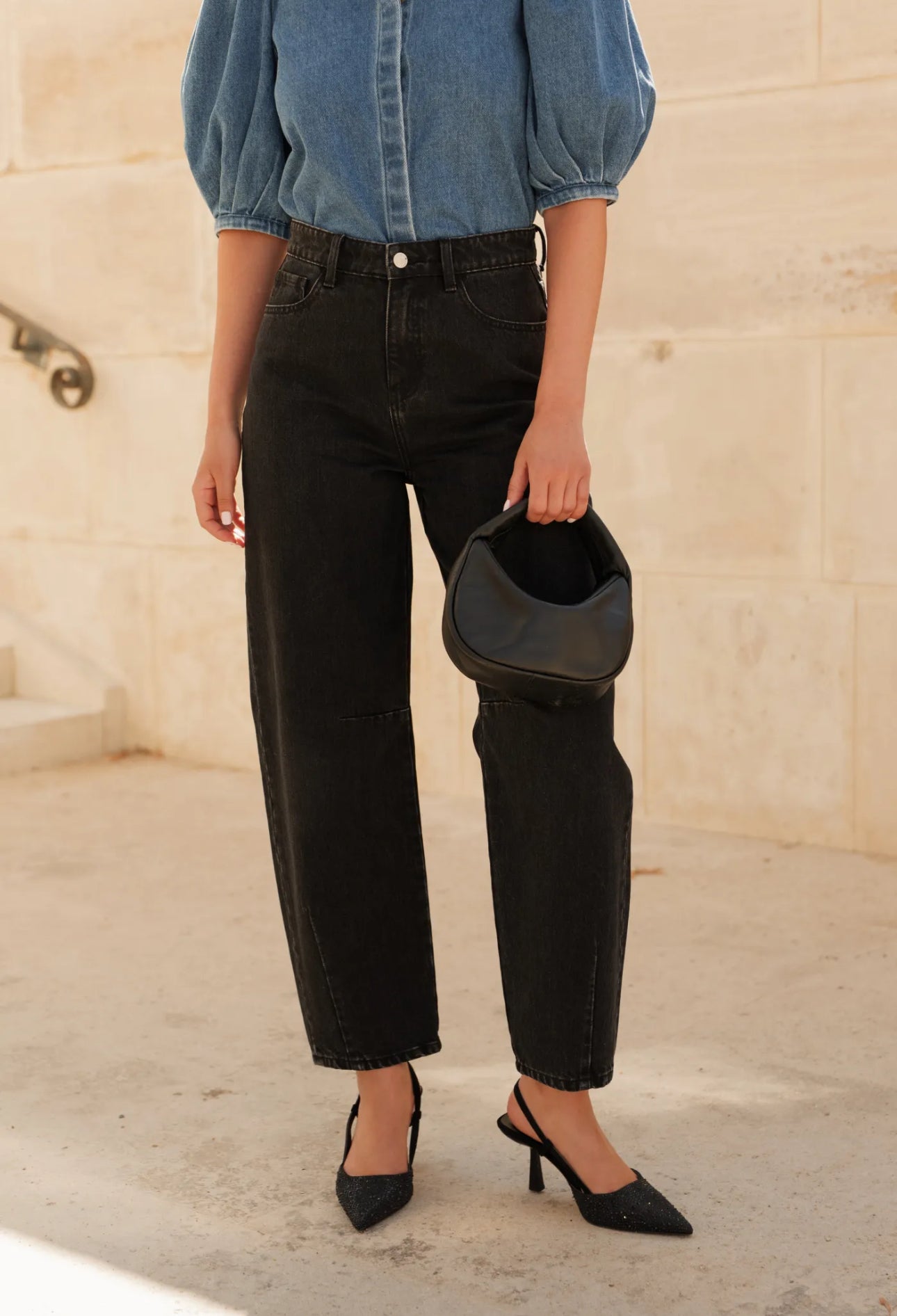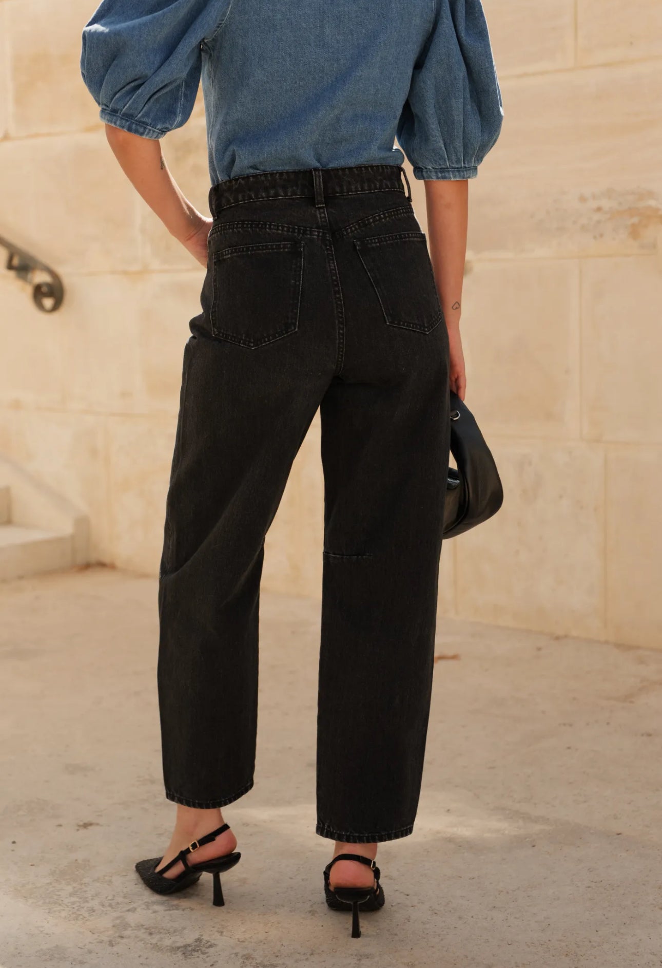 Ce jean noir à la coupe droite et taille haute met en valeur la silhouette tout en offrant un confort absolu.