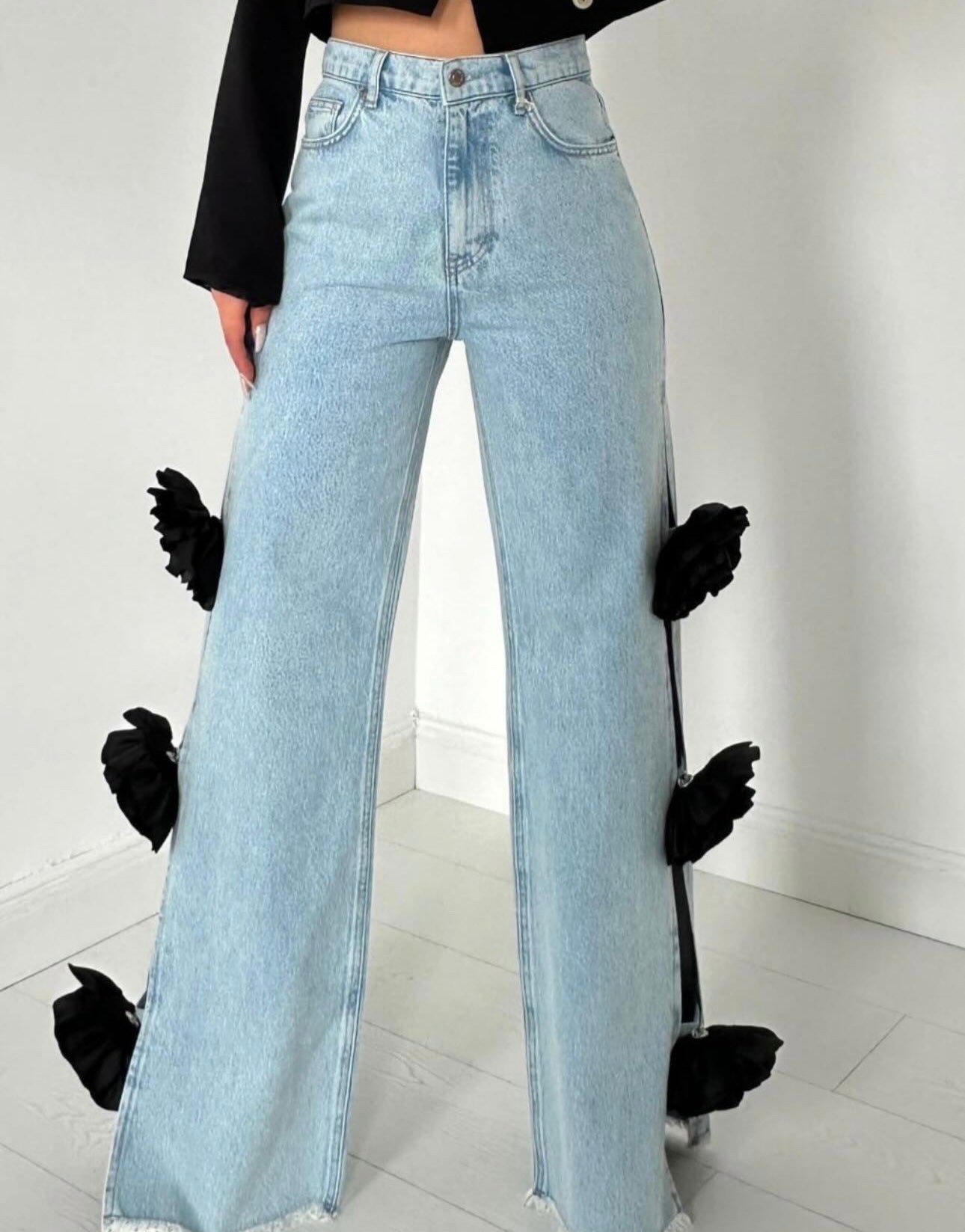 Cette pièce unique revisite le denim classique avec une touche artistique : de sublimes fleurs noires en tissu sont disposées sur les côtés, apportant volume, contraste et élégance. Sa coupe droite légèrement évasée flatte la silhouette tout en restant confortable et tendance.